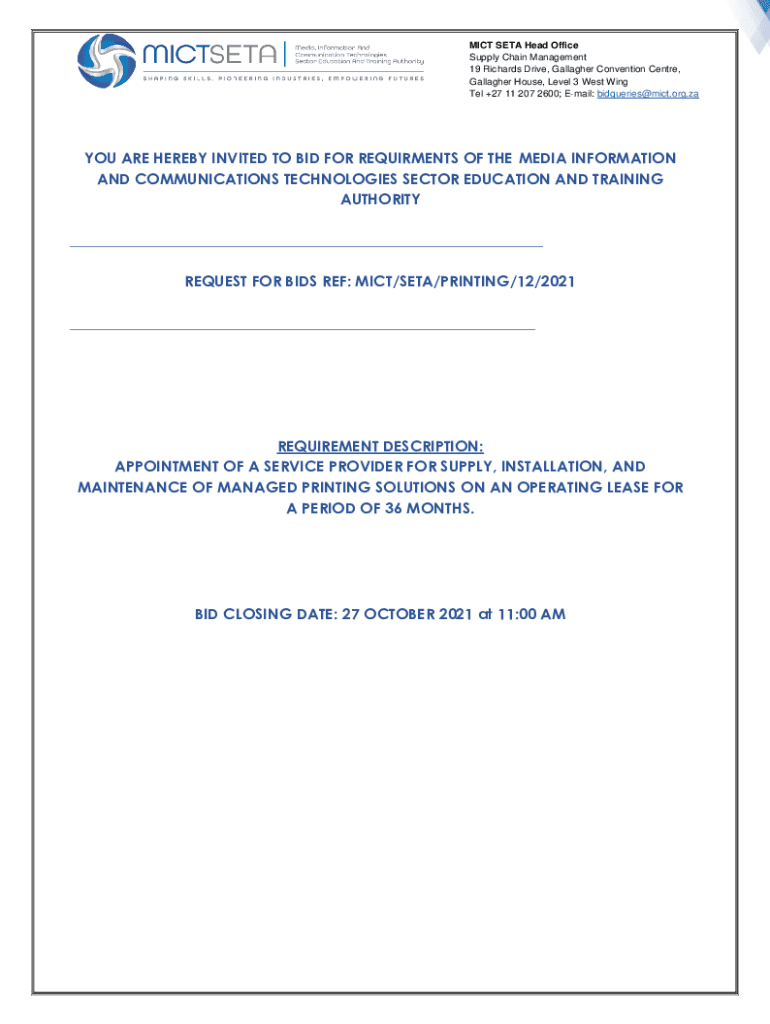 MICE SET Head Office Supply Chain Management 19 Richards Drive, Gallagher Convention Center, Gallagher House, Level 3 West Wing Tel +27 11 207 2600; Email: bidqueries@mict.org.zaYOU ARE HEREBY INVITED