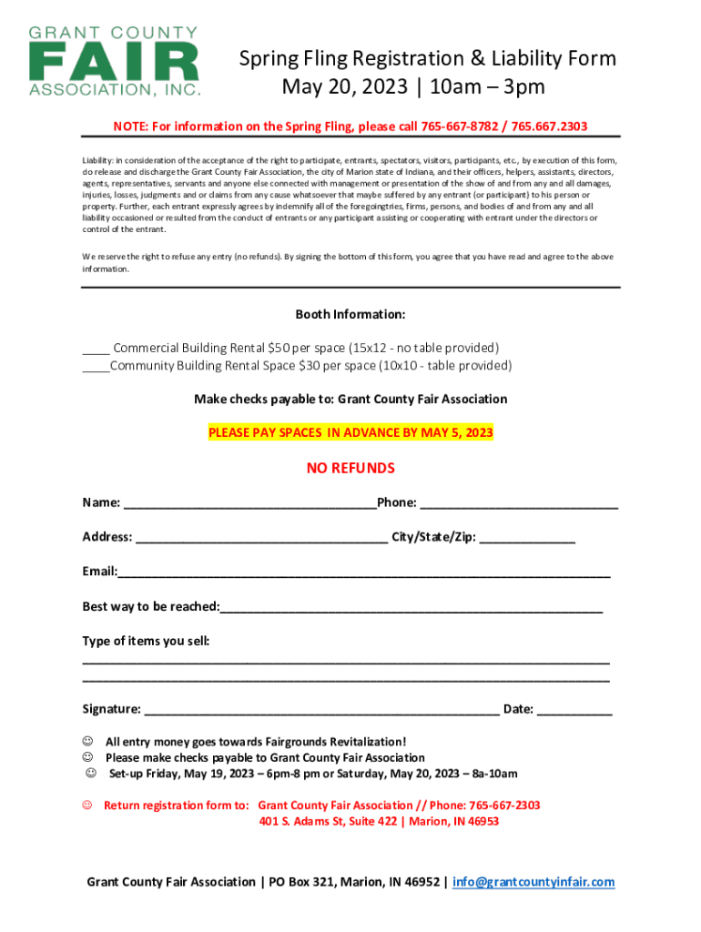 Spring Fling Registration & Liability Form May 20, 2023 | 10am 3pm NOTE: For information on the Spring Fling, please call 7656678782 / 765.667.2303 Liability: in consideration of the acceptance of
