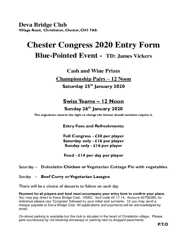 Village Road, Christen, Chester, CH3 7AS. Chester Congress 2020 Entry Form