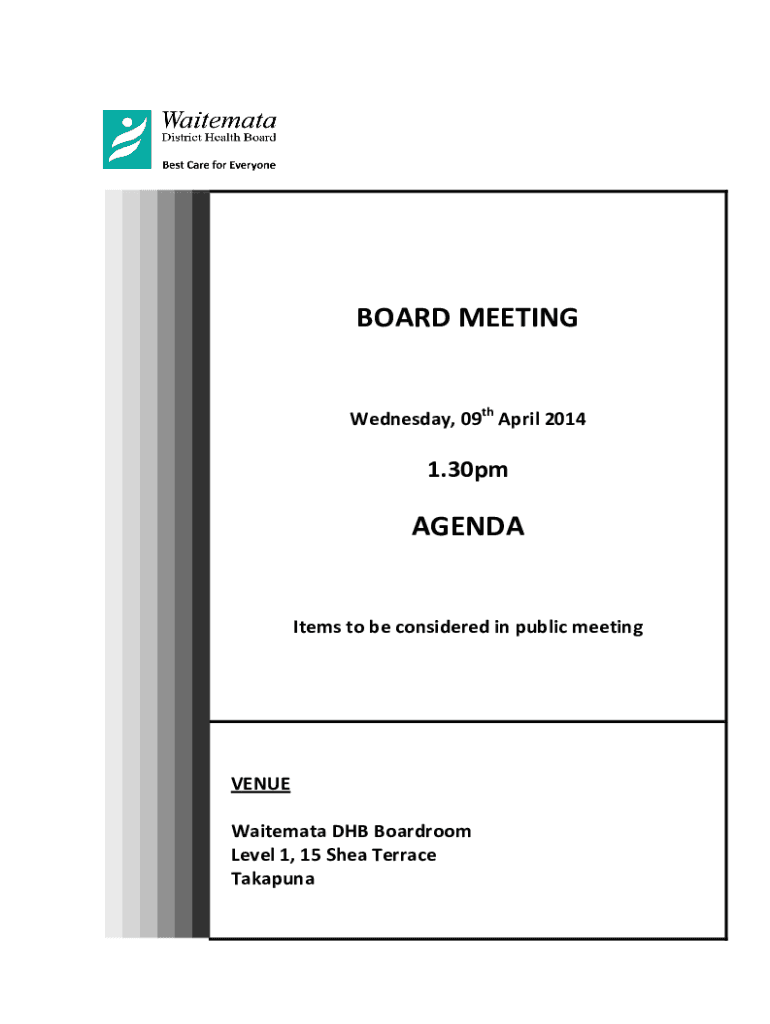 BOARD MEETING Wednesday, 09th April 20141.30pmAGENDAItems to be considered in public meetingVENUE Automata DUB Boardroom Level 1, 15 Shea Terrace TakapunaKarakia E the Keying e the Whinger E mini