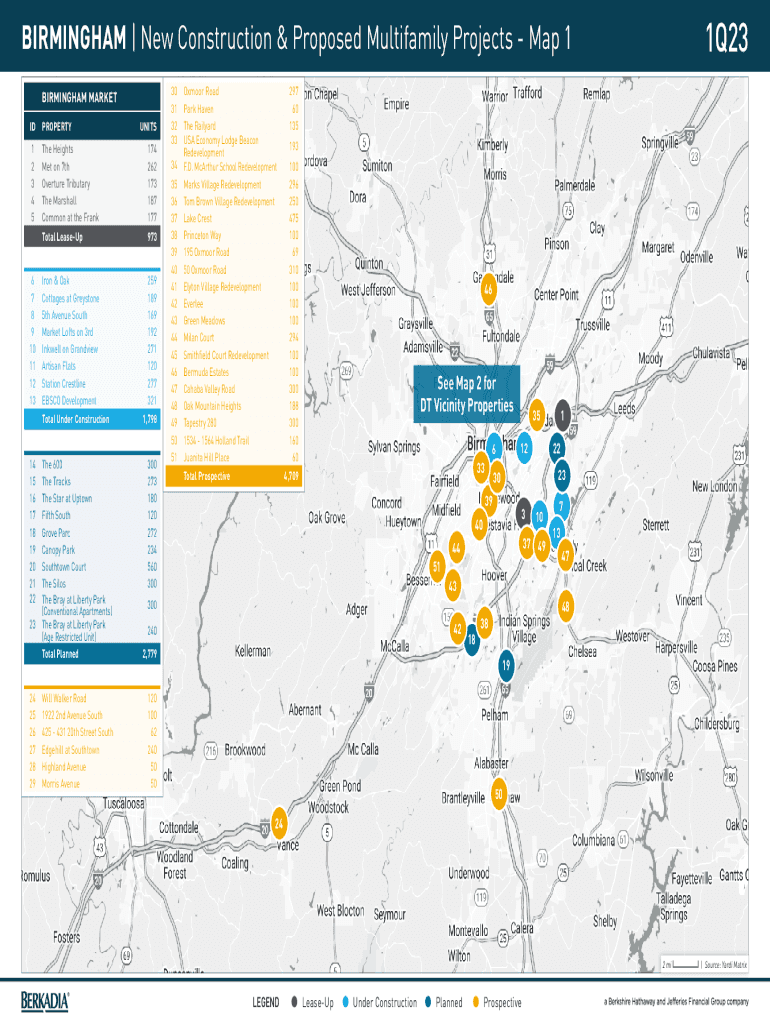 1Q23BIRMINGHAM | New Construction & Proposed Multifamily Projects Map 1 BIRMINGHAM MARKET IDPROPERTY1 2 3 4 5The Heights Met on 7th Overture Tributary The Marshall Common at the Frank174 262 173 187