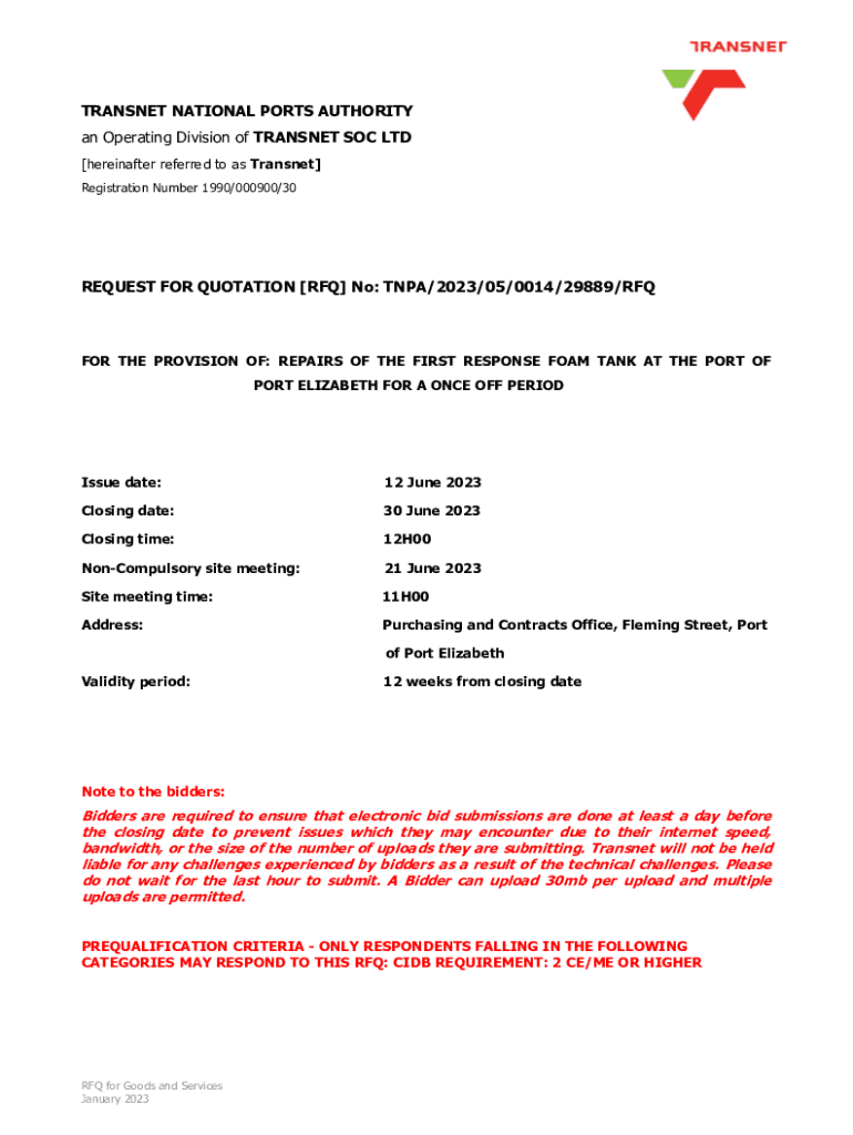 Get the free REQUEST FOR QUOTATION RFQ No: TNPA/2023/05/0014/29889/RFQ