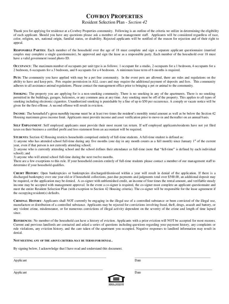 COWBOY PROPERTIES Resident Selection Plan Section 42 Thank you for applying for residence at a Cowboy Properties community. Following is an outline of the criteria we utilize in determining the eligibility