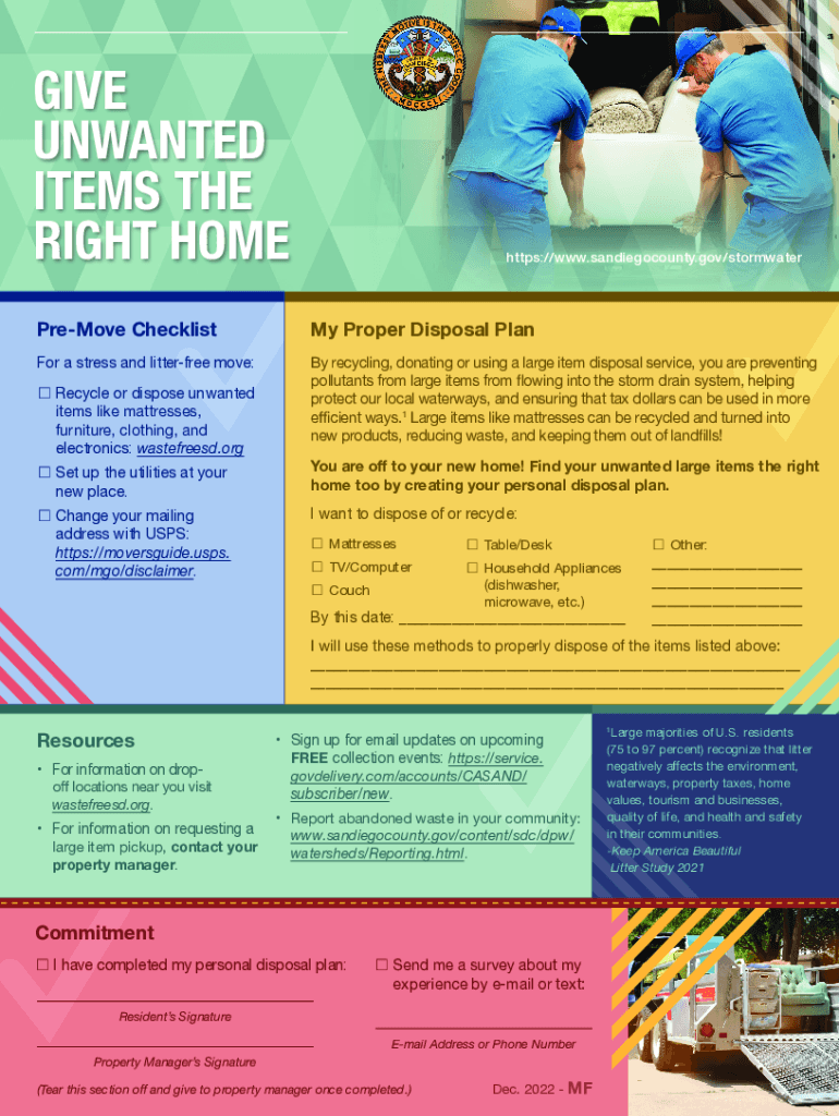GIVE UNWANTED ITEMS THE RIGHT Hymettus://www.sandiegocounty.gov/stormwaterPreMove Checklist Proper Disposal Platform a stress and litter free move:By recycling, donating or using a large item disposal