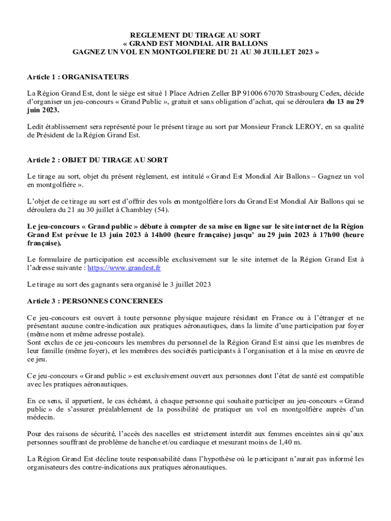 REGLEMENT DU TIRAGE AU SORT GRAND EST MONDIAL AIR BALLONS GAGNEZ UN VOL EN MONTGOLFIERE DU 21 AU 30 JUILLET 2023 Article 1 : ORGANISATEURS La Rgion Grand Est, dont le sige est situ 1 Place Adrien