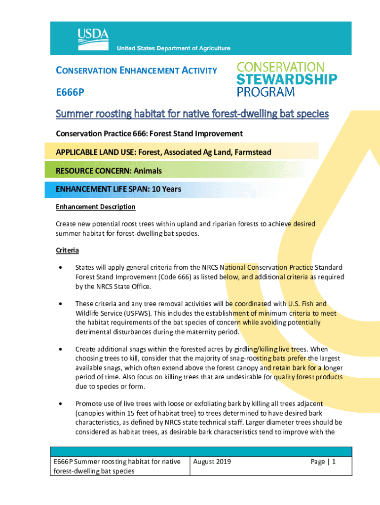CONSERVATION ENHANCEMENT ACTIVITY E666P Summer roosting habitat for native forest dwelling bat species Conservation Practice 666: Forest Stand Improvement APPLICABLE LAND USE: Forest, Associated Ag