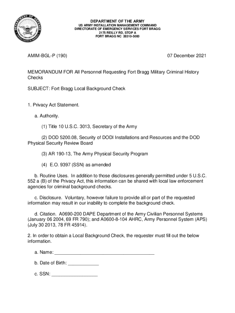 DEPARTMENT OF THE ARMY US ARMY INSTALLATION MANAGEMENT COMMAND DIRECTORATE OF EMERGENCY SERVICES FORT BRAGG 2175 REILLY RD, STOP A FORT BRAGG NC 283105000AMIMBGLP (190)07 December 2021MEMORANDUM FOR