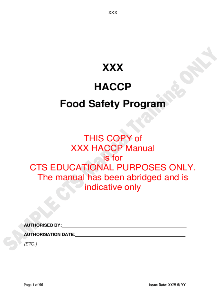 XXX HACCP Food Safety Programs COPY of XXX HACCP Manual is for CTS EDUCATIONAL PURPOSES ONLY. The manual has been abridged and is indicative onlyAUTHORISED BY:___ Authorization DATE:___ (ETC.) Page