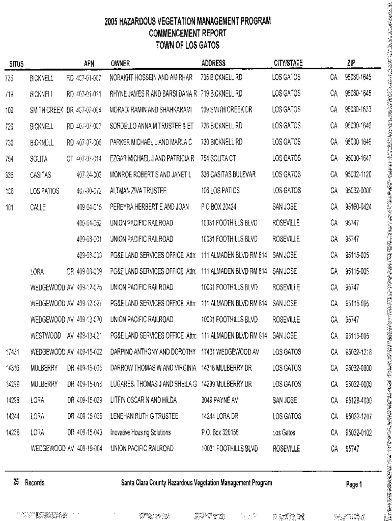 2005 HAZARDOUS VEGETATION MANAGEMENT PROGRAM COMMENCEMENT REPORT TOWN OF LOS GATOSAPNSITUSOWNERADDRESSZIPCITY/STATE735BICKNELLRD 40701007NOBAKHT HOSSEIN AND AMIRHAR735 BUCKNELL RULES GATOSCA950301645719BICKNELLRD