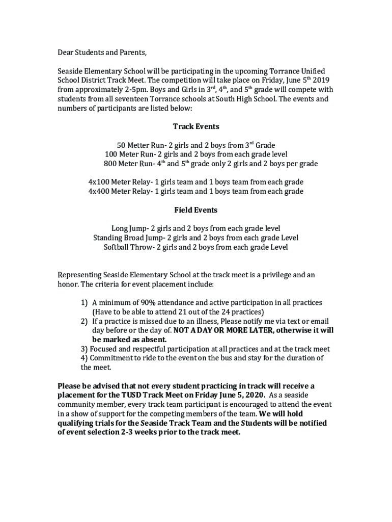 Dear Students and Parents, Seaside Elementary School will be participating in the upcoming Torrance Unified School District Track Meet. The competition will take place on Friday, June 5 TH 2019 from