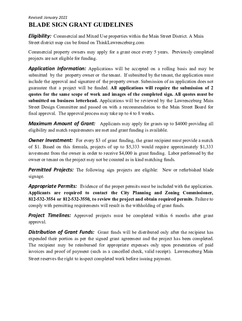Revised: January 2021BLADE SIGN GRANT GUIDELINES Eligibility: Commercial and Mixed Use properties within the Main Street District. A Main Street district map can be found on ThinkLawrenceburg. Noncommercial