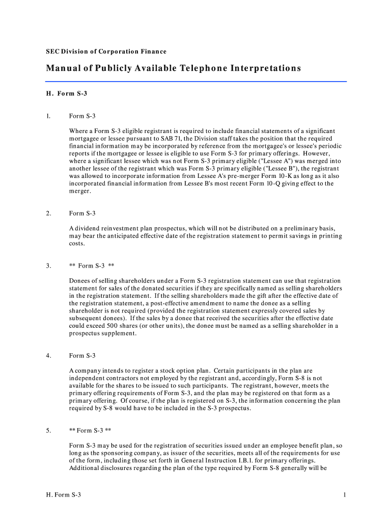 SEC Division of Corporation Finance Manual of Publicly Available Telephone Interpretations H. Form S-3 1. Form S-3 Where a Form S-3 eligible registrant is required to include financial statements
