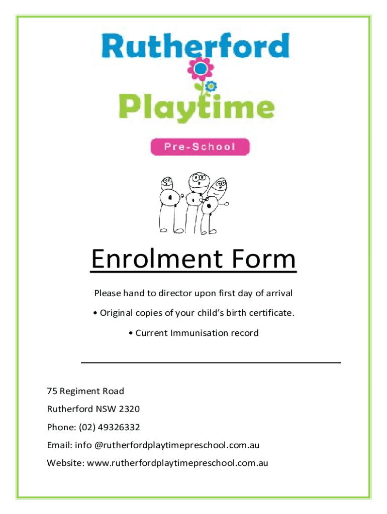 EnrolmentForm Pleasehandtodirectoruponfirstdayofarrival Originalcopiesofyourchildsbirthcertificate. CurrentImmunisationrecord 75RegimentRoad RutherfordNSW2320 Phone:(02)49326332 Email:info@rutherfordplaytimepreschool.com.AU