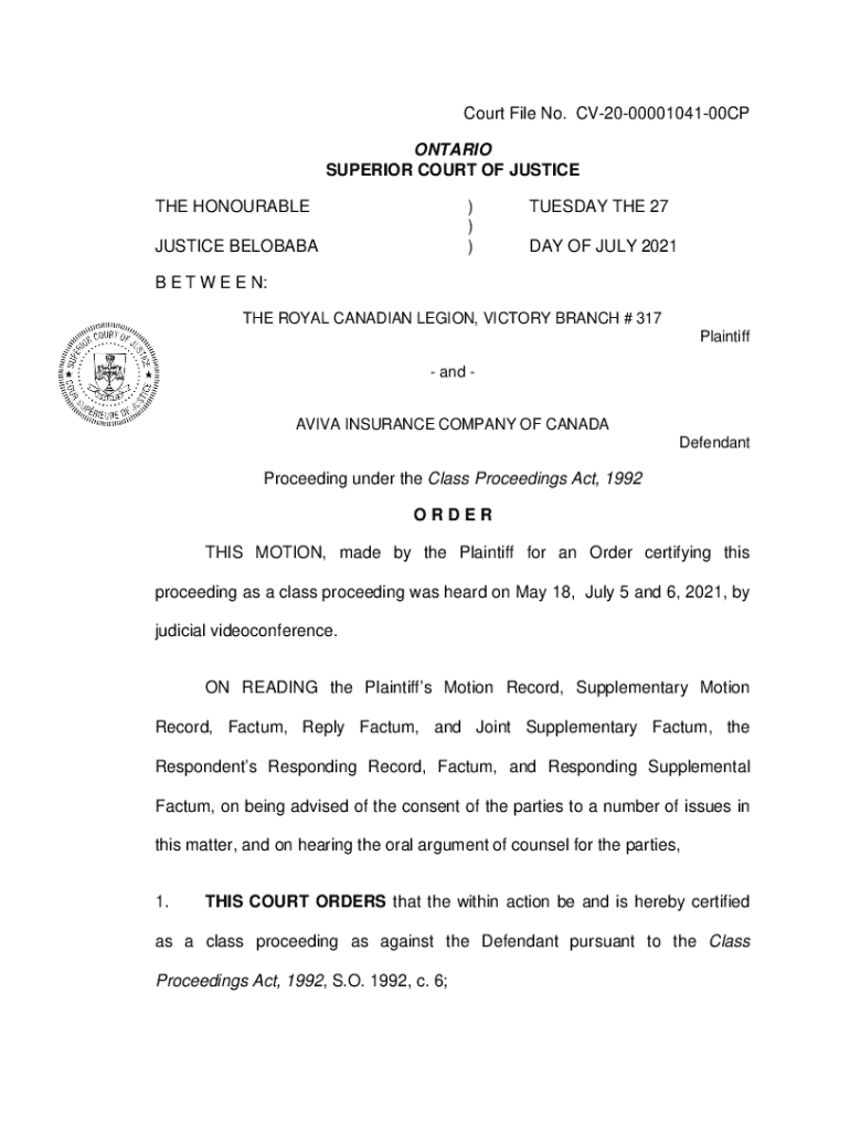 Court File No. CV200000104100CP ONTARIO SUPERIOR COURT OF JUSTICE THE HONORABLE)))JUSTICE BELOBABATUESDAY THE 27-DAY OF JULY 2021B E T W E E N: THE ROYAL CANADIAN LEGION, VICTORY BRANCH # 317 Plaintiff