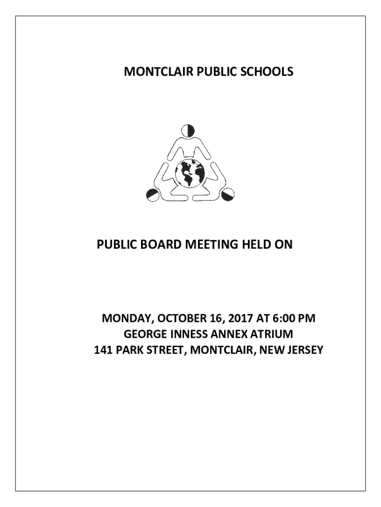 MONTCLAIR PUBLIC SCHOOLSPUBLIC BOARD MEETING HELD MONDAY, OCTOBER 16, 2017, AT 6:00 PM GEORGE INN ESS ANNEX ATRIUM 141 PARK STREET, MONTCLAIR, NEW JERSEYMinutes/Public Board Meeting Monday, October