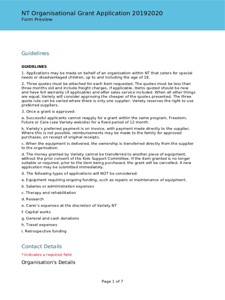 NT Organizational Grant Application 20192020 Form PreviewGuidelines GUIDELINES 1. Applications may be made on behalf of an organization within NT that caters for special needs or disadvantaged children,