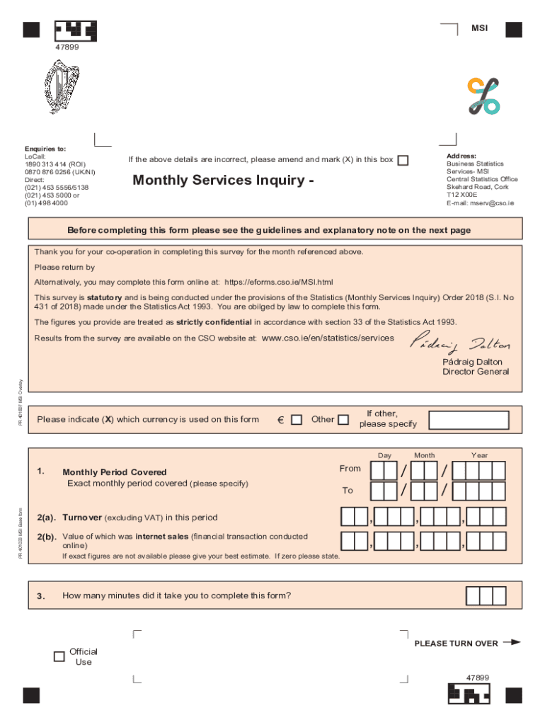 MSI 47899Enquiries to: Local: 1890 313 414 (ROI) 0870 876 0256 (UK/NI) Direct: (021) 453 5556/5138 (021) 453 5000 or (01) 498 4000Address: Business Statistics Services MSI Central Statistics Office