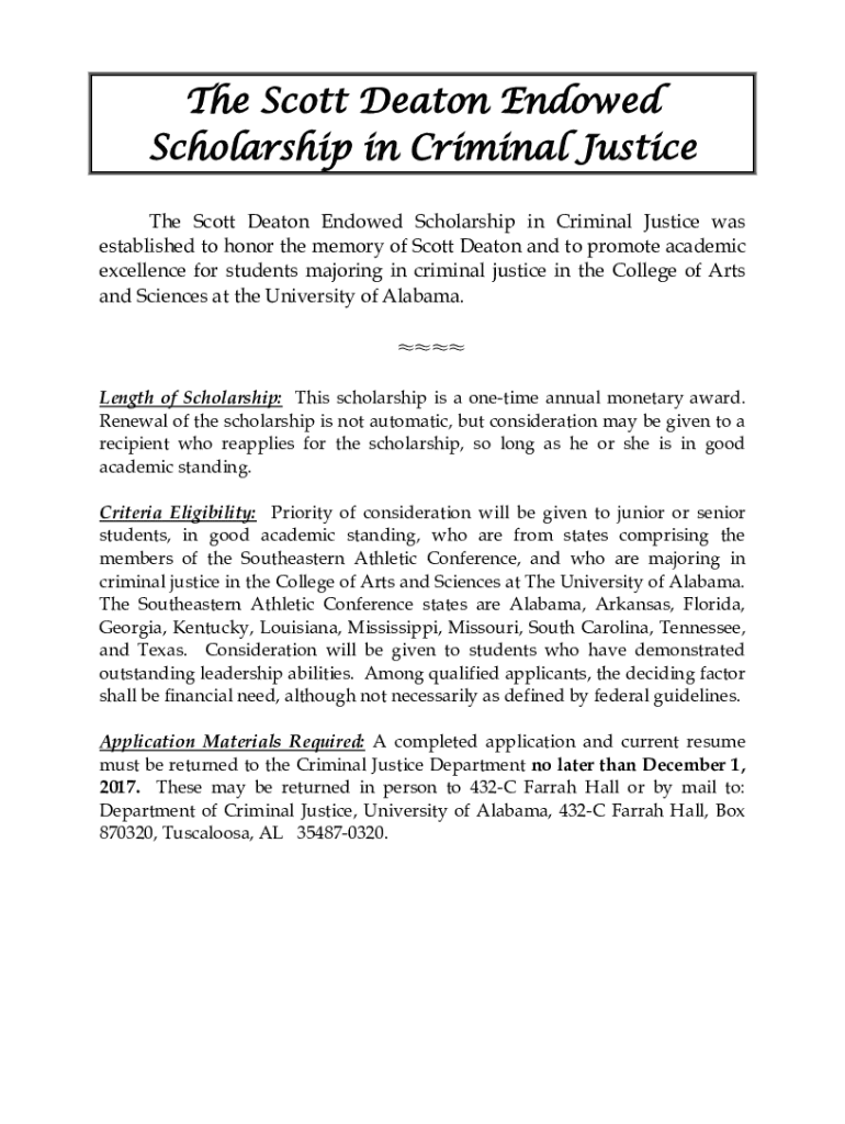 The Scott Eaton Endowed Scholarship in Criminal Justice The Scott Eaton Endowed Scholarship in Criminal Justice was established to honor the memory of Scott Eaton and to promote academic excellence