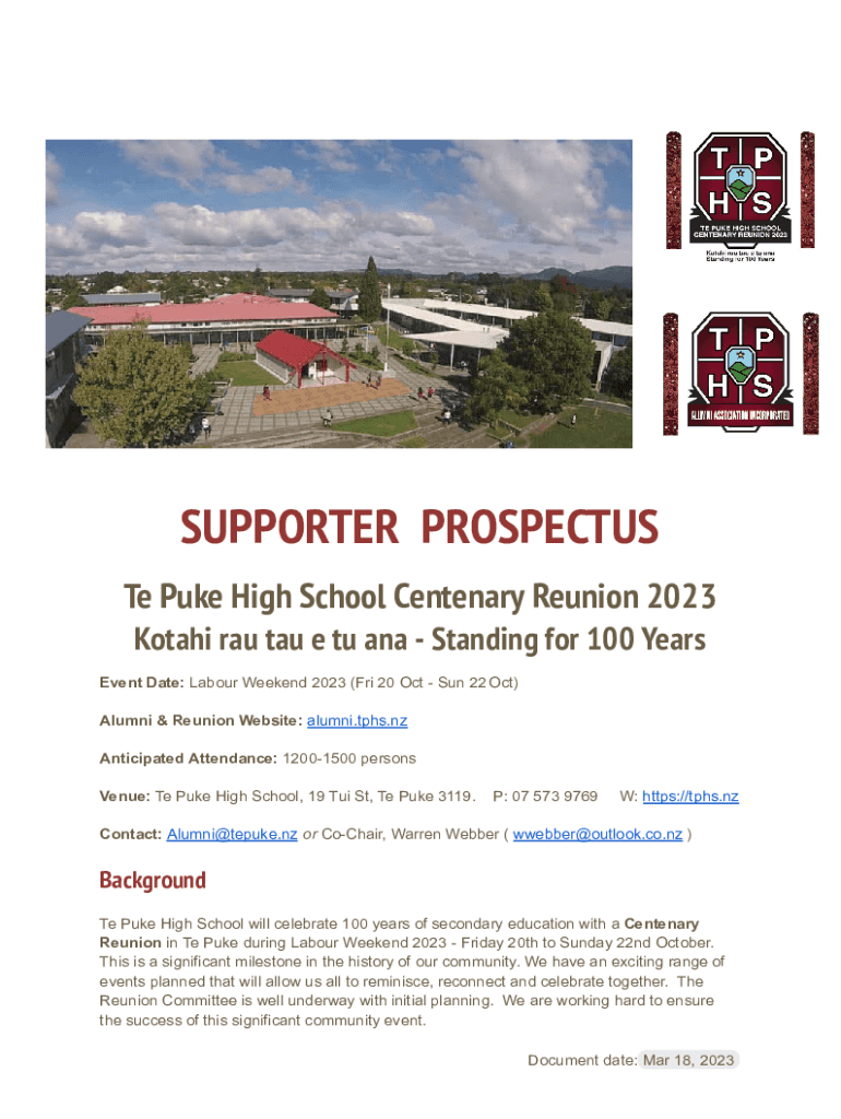 SUPPORTER PROSPECTUS Te Puke High School Centenary Reunion 2023 Both ran tau e TU Ana Standing for 100 Years Event Date: Labor Weekend 2023 (Fri 20 Oct Sun 22 Oct) Alumni & Reunion Website: alumni.ifs.NZ