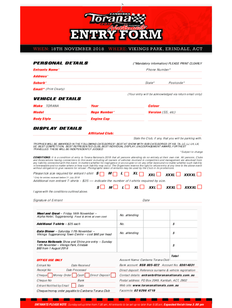 ENTRY FORM WHEN: 1TH NOVEMBER 201 WHERE: VIKINGS PARK, BRINDLE, PERSONAL DETAILS(*Mandatory information) PLEASE PRINT CLEARLYPhone Number×Entrants Name* Address×State×Suburb×Postcode×Email* (Print