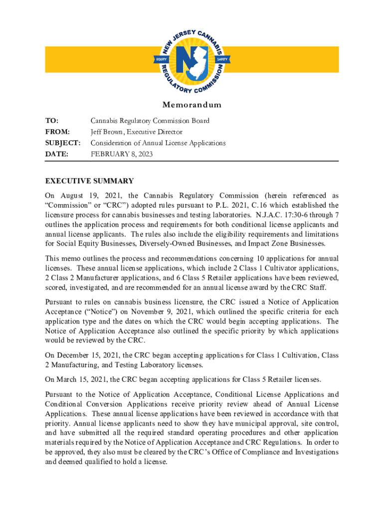 Memorandum TO: FROM: SUBJECT: DATE:Cannabis Regulatory Commission Board Jeff Brown, Executive Director Consideration of Annual License Applications FEBRUARY 8, 2023EXECUTIVE SUMMARY On August 19,