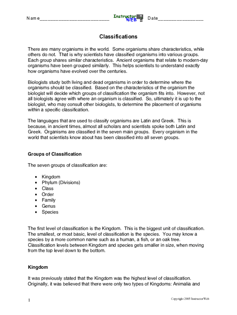 N am e___ ___ __ ___ ___ ___ __ __D ate_ ___ ___ ___ __Classifications There are many organisms in the world. Some organisms share characteristics, while others do not. That is why scientists have
