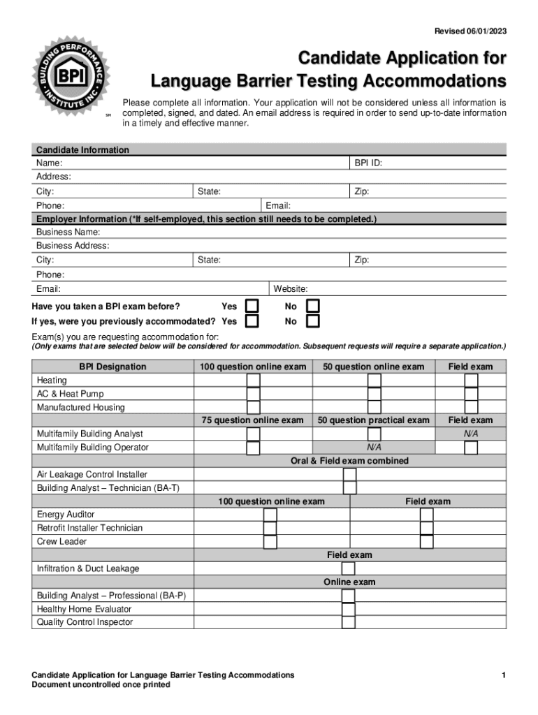 Revised 06/01/2023Candidate Application for Language Barrier Testing Accommodations Please complete all information. Your application will not be considered unless all information is completed, signed,