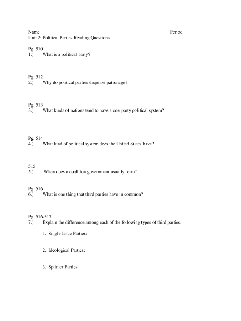 Name ___ Unit 2: Political Parties Reading QuestionsPeriod ___Pg. 510 1.) What is a political party? Pg. 512 2.) Why do political parties dispense patronage? Pg. 513 3.) What kinds of nations tend