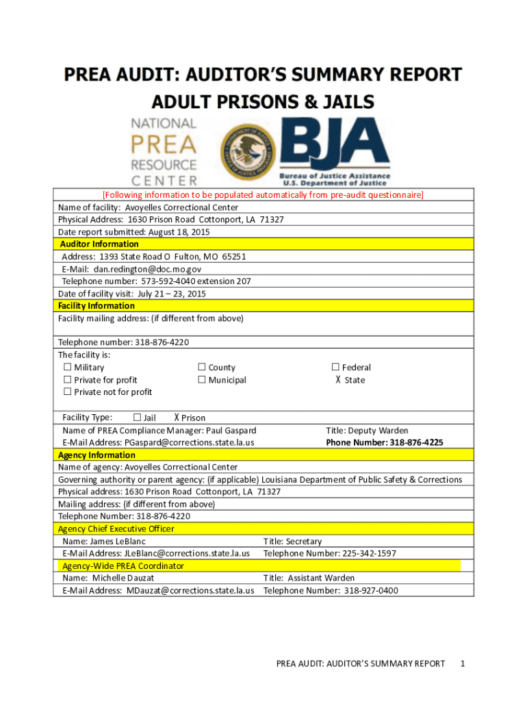 [Following information to be populated automatically from preaudit questionnaire] Name of facility: Avoyelles Correctional Center Physical Address: 1630 Prison Road Cotton port, LA 71327 Date report