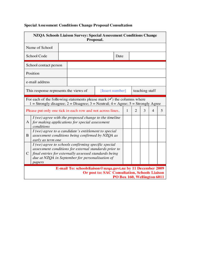 Special Assessment Conditions Change Proposal Consultation NZ QA Schools Liaison Survey: Special Assessment Conditions Change Proposal. Name of School CodeDateSchool contact person Position email