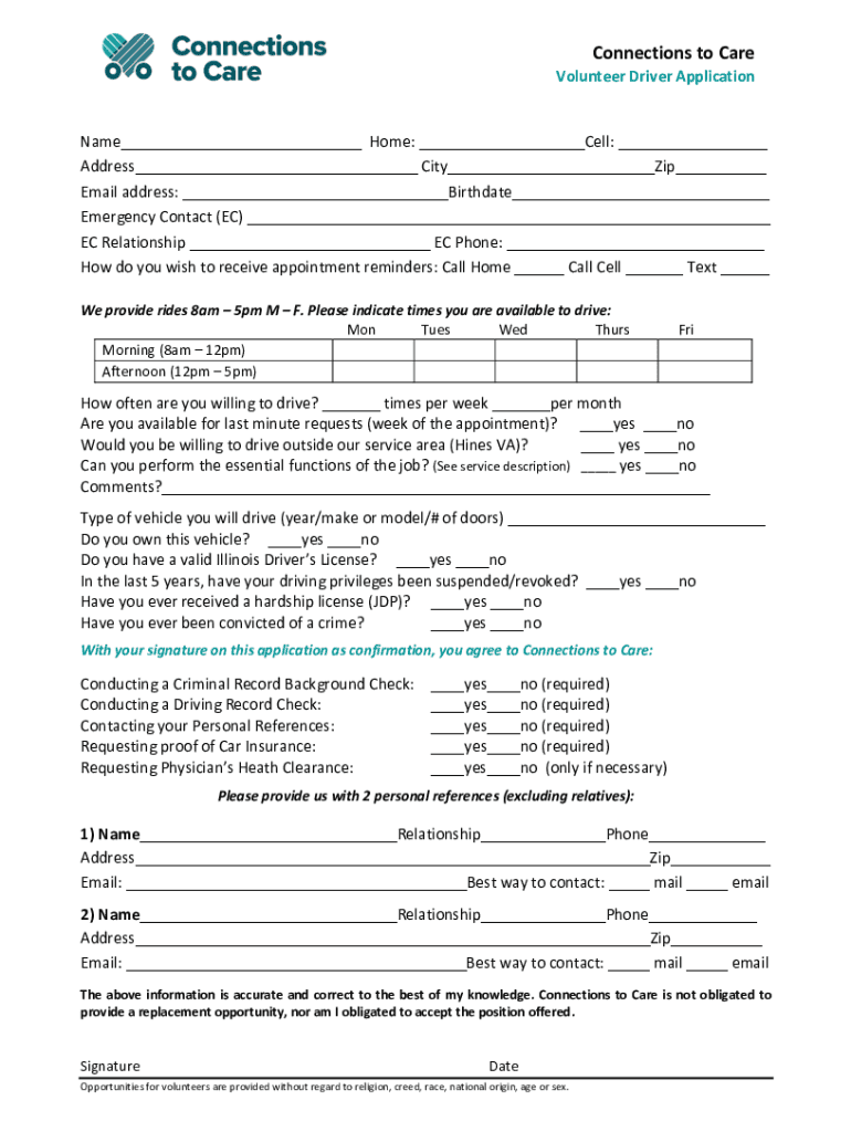 Connections to Care Volunteer Driver ApplicationName___ Home: ___Cell: ___ Address___ City___Zip___ Email address: ___Birthdate___ Emergency Contact (EC) ___ EC Relationship ___ EC Phone: ___ How