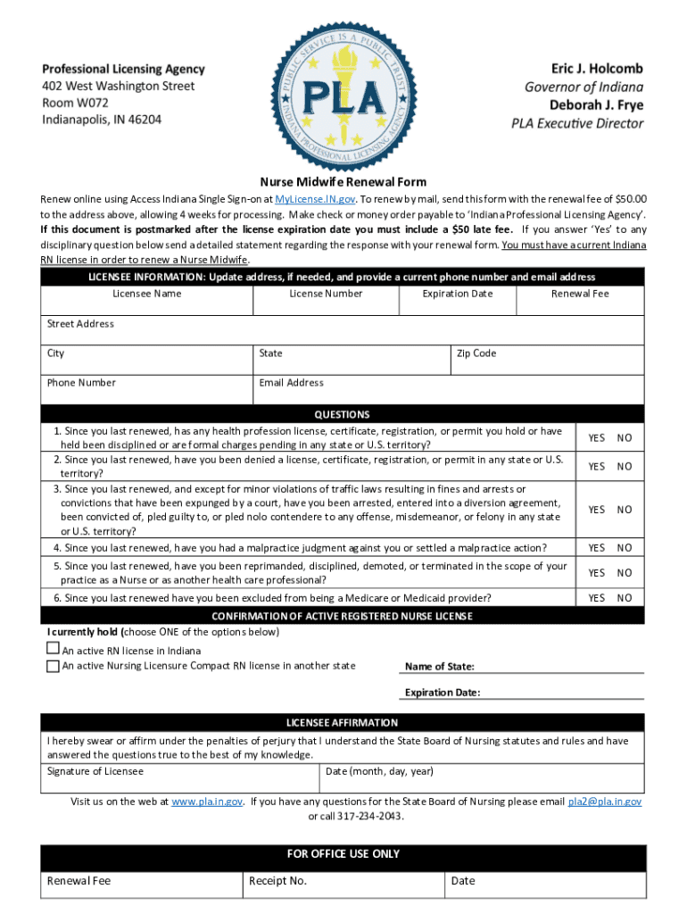 Nurse Midwife Renewal Form Renew online using Access Indiana Single Signor at License.IN.gov. To renew by mail, send this form with the renewal fee of $50.00 to the address above, allowing 4 weeks