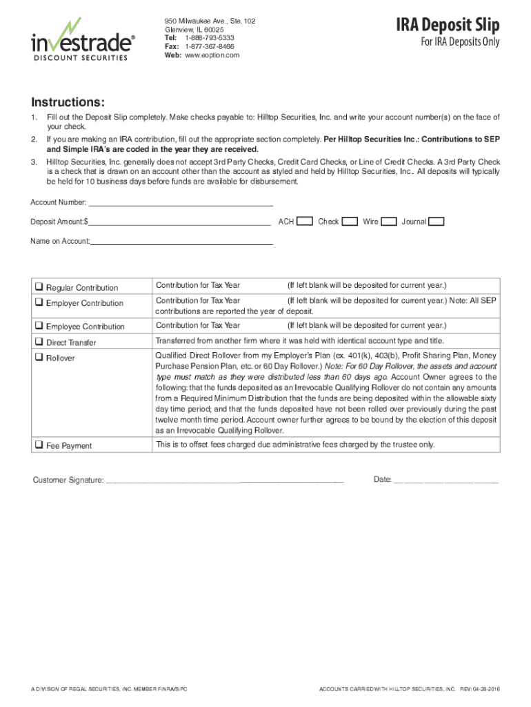IRA Deposit Slip950 Milwaukee Ave., Ste. 102 Glenview, IL 60025 Tel: 18887935333 Fax: 18773678466 Web: www.eoption.comFor IRA Deposits OnlyInstructions: 1. Fill out the Deposit Slip completely. Make