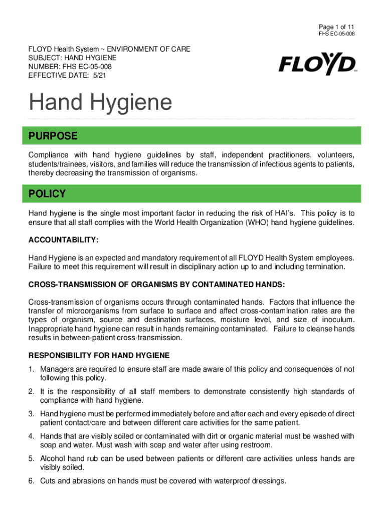 Page 1 of 11 FHS EC05008FLOYD Health System ENVIRONMENT OF CARE SUBJECT: HAND HYGIENE NUMBER: FHS EC05008 EFFECTIVE DATE: 5/21Hand Hygiene PURPOSE Compliance with hand hygiene guidelines by staff,