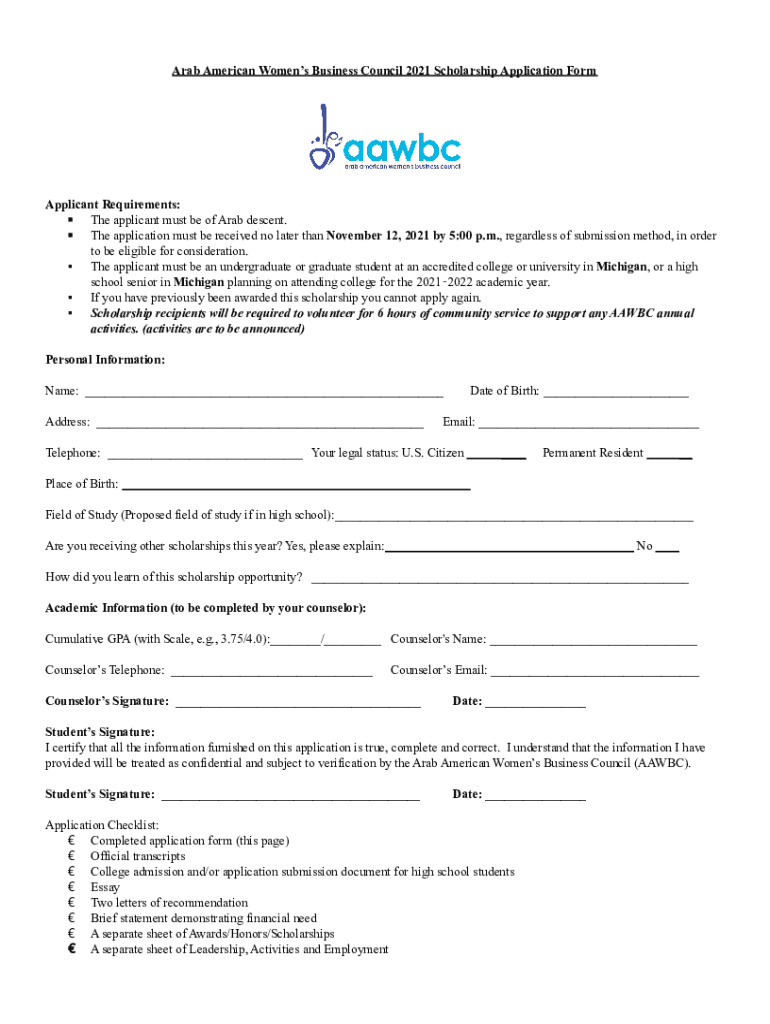 Arab American Women's Business Council 2021 Scholarship Application FormApplicant Requirements: The applicant must be of Arab descent. The application must be received no later than November 12, 2021,