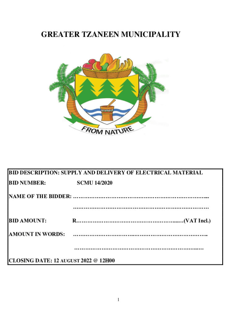 GREATER TAKEN MUNICIPALITY BID DESCRIPTION: SUPPLY AND DELIVERY OF ELECTRICAL MATERIAL BID NUMBER:CMU 14/2020NAME OF THE BIDDER: .... BID AMOUNT:R...(VAT Incl.)AMOUNT IN WORDS:...