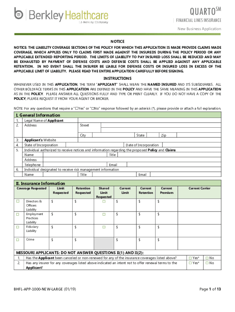 QUARTOS | FINANCIAL LINES INSURANCE New Business Application NOTICE: THE LIABILITY COVERAGE SECTIONS OF THE POLICY FOR WHICH THIS APPLICATION IS MADE PROVIDE CLAIMS MADE COVERAGE, WHICH APPLIES ONLY
