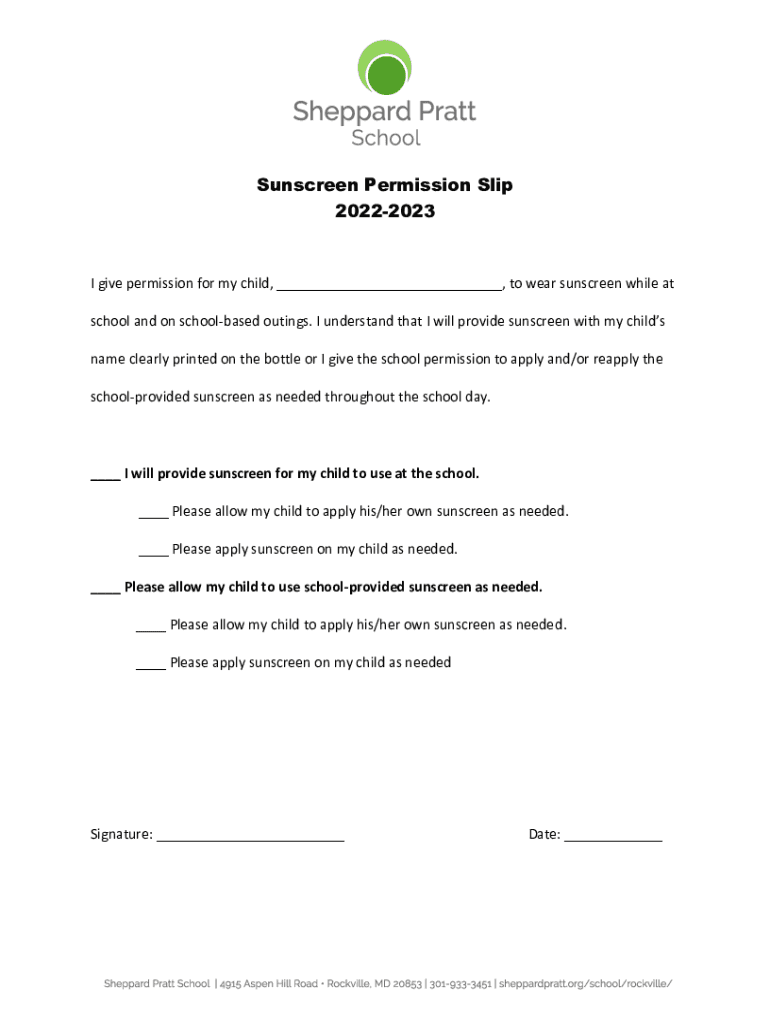 Sunscreen Permission Slip 20222023I give permission for my child, ___, to wear sunscreen while at school and on school based outings. I understand that I will provide sunscreen with my children name