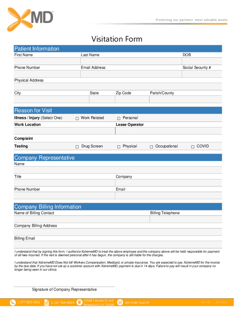 Visitation Form Patient Information First Nameless NameDOBPhone NumberEmail AddressSocial Security #Physical Address CityStateZip CodeParish/CountyReason for Visit Illness / Injury (Select One)Work