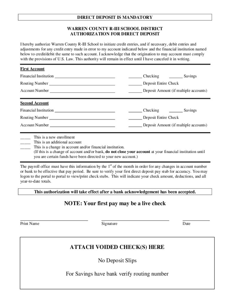 DIRECT DEPOSIT IS MANDATORY WARREN COUNTY III SCHOOL DISTRICT AUTHORIZATION FOR DIRECT DEPOSIT I hereby authorize Warren County III School to initiate credit entries, and if necessary, debit entries