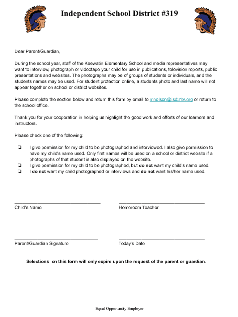 Independent School District #319Dear Parent/Guardian, During the school year, staff of the Keewatin Elementary School and media representatives may want to interview, photograph or videotape your
