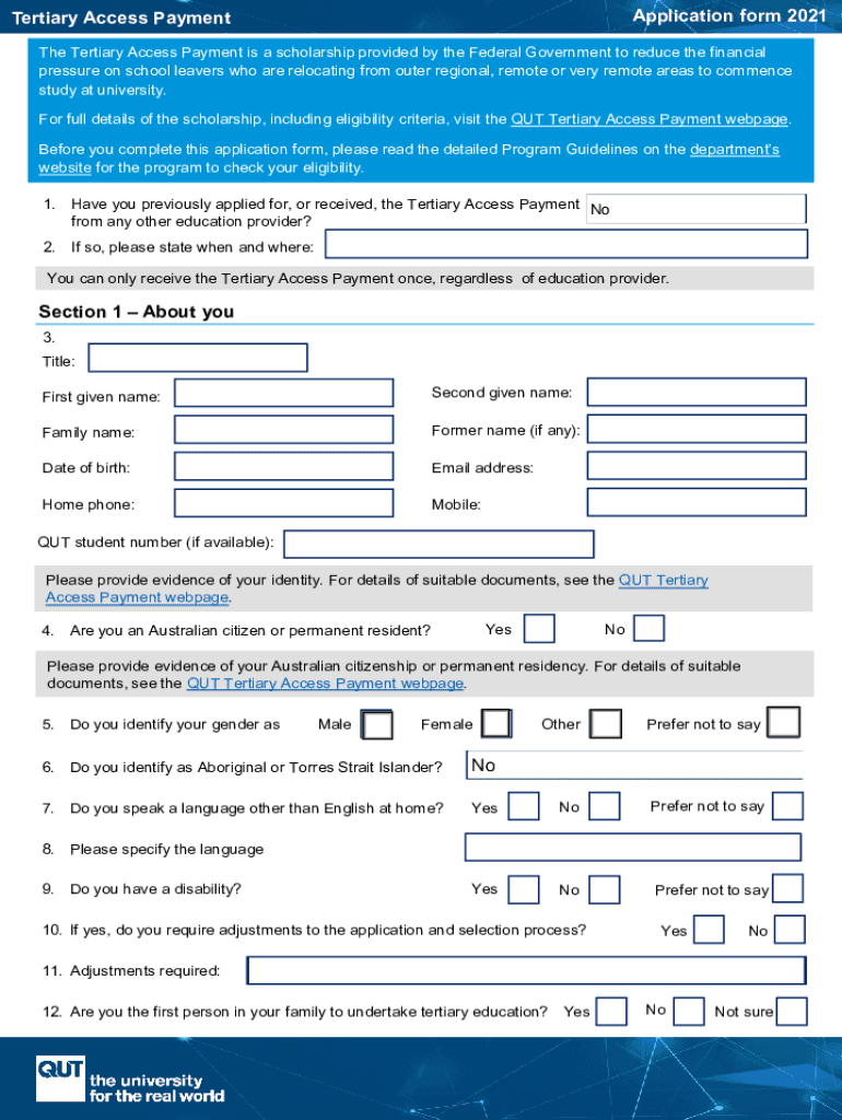 Application form 2021Tertiary Access Payment Tertiary Access Payment is a scholarship provided by the Federal Government to reduce the financial pressure on school-leavers who are relocating from