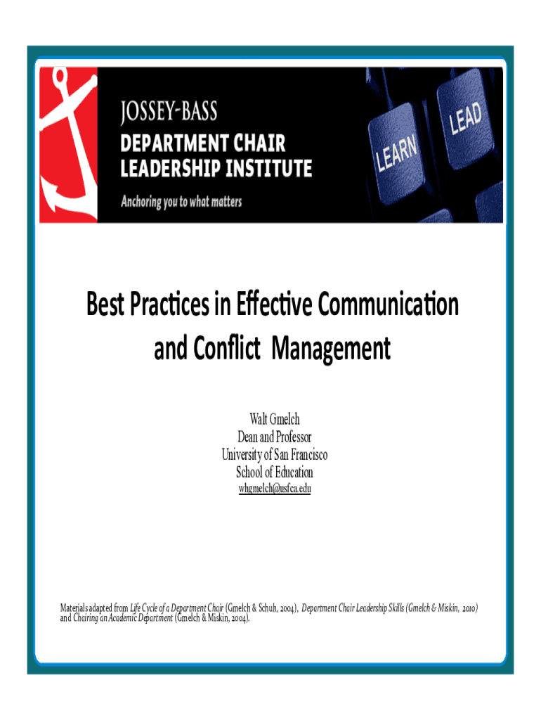 TheJosseyBassDepartmentChairLeadershipIns6tuteBestPrac×cosine×veCommunica×on andConictManagement Walt Guelph Dean and Professor University of San Francisco School of Education whgmelch@usfca.eduMaterialsadaptedfromLifeCycleofaDepartmentChair(Gmelch&Schuh,2004),