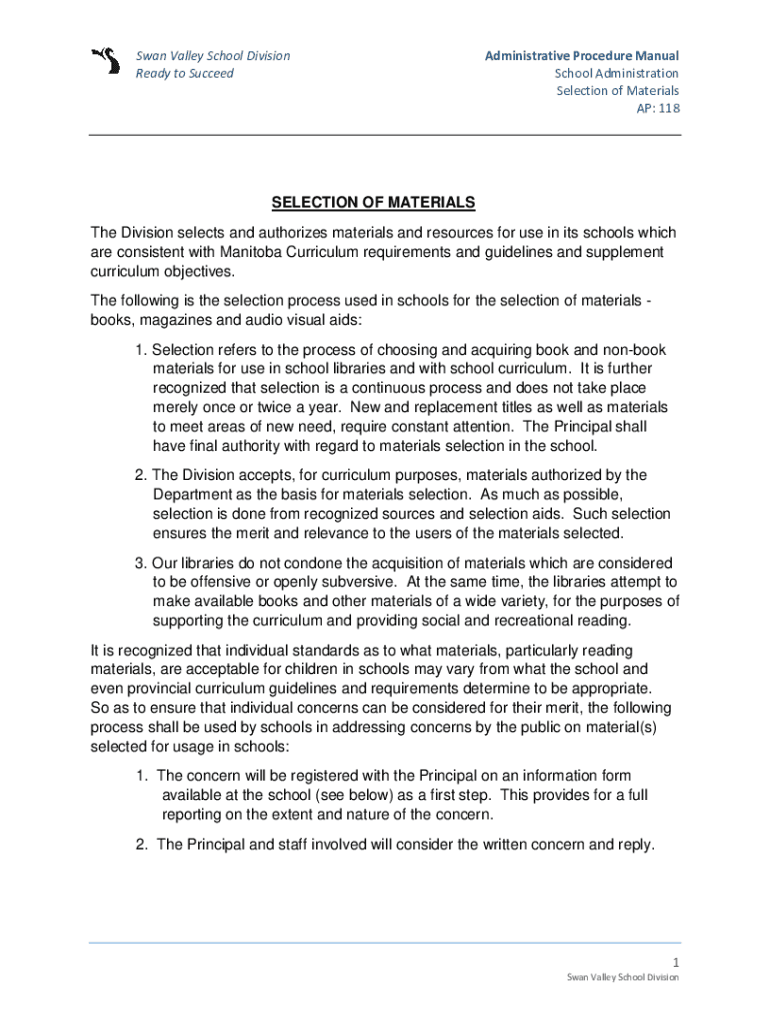 Swan Valley School Division Ready to SucceedAdministrative Procedure Manual School Administration Selection of Materials AP: 118SELECTION OF MATERIALS The Division selects and authorizes materials