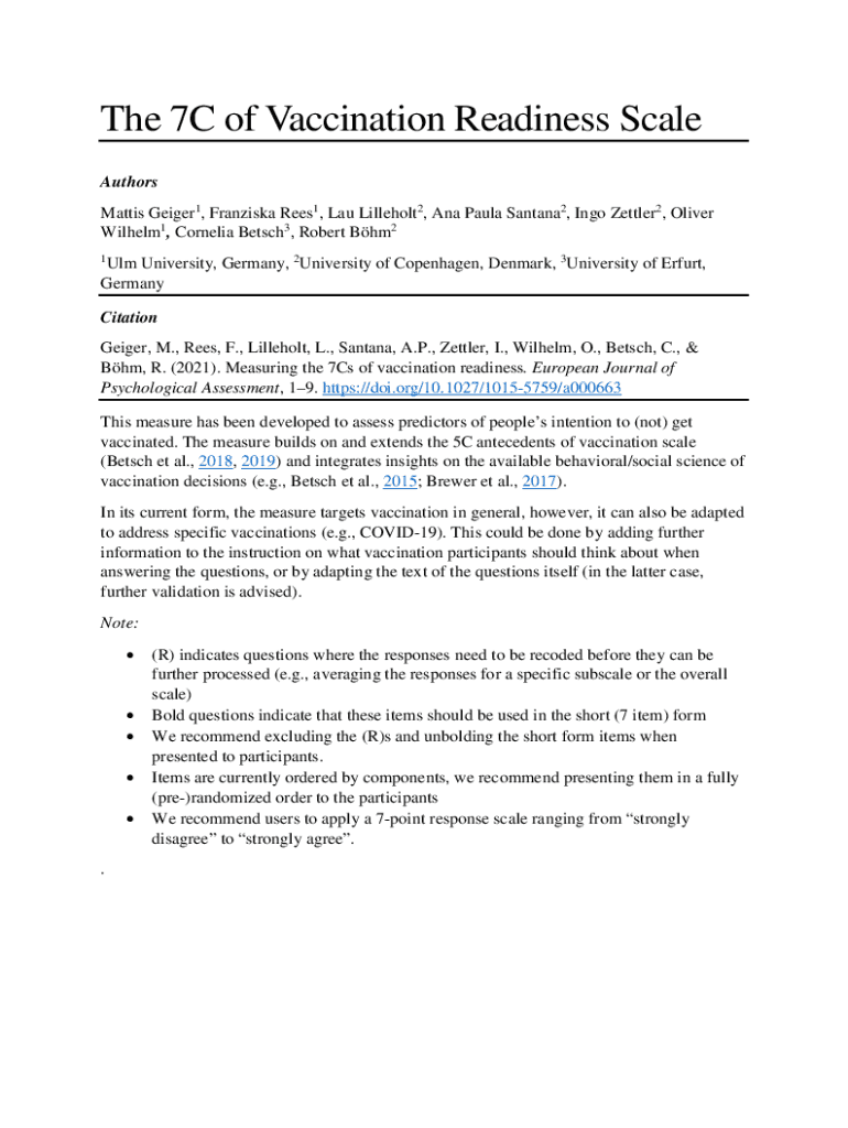 The 7C of Vaccination Readiness Scale Authors Mathis Geiger1, Franziska Rees1, LAU Lilleholt2, Ana Paula Santana2, Ingo Zettler2, Oliver Wilhelm1, Cornelia Betsch3, Robert Bhm2 1Ulm University, Germany,