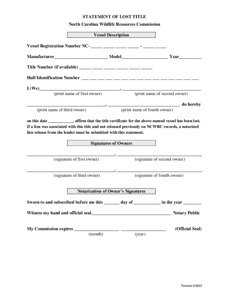 STATEMENT OF LOST TITLE North Carolina Wildlife Resources Commission Vessel Description Vessel Registration Number NC ___ ___ ___ ___ ___ ___ Manufacturer___ Model___ Year___ Title Number (if available)