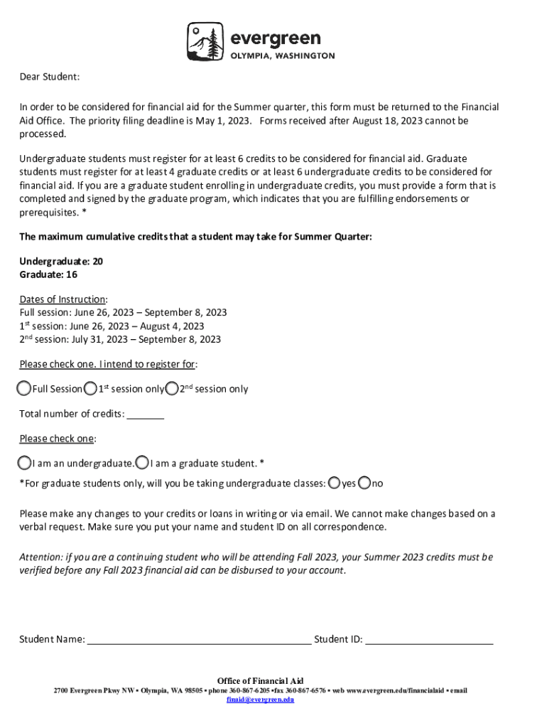 Summer 2023 Financial Aid Application, Policy, and Procedure Complete and return the Summer Interest Form by May 1, 2023. If your interest form is late, it may not be processed before summer quarter