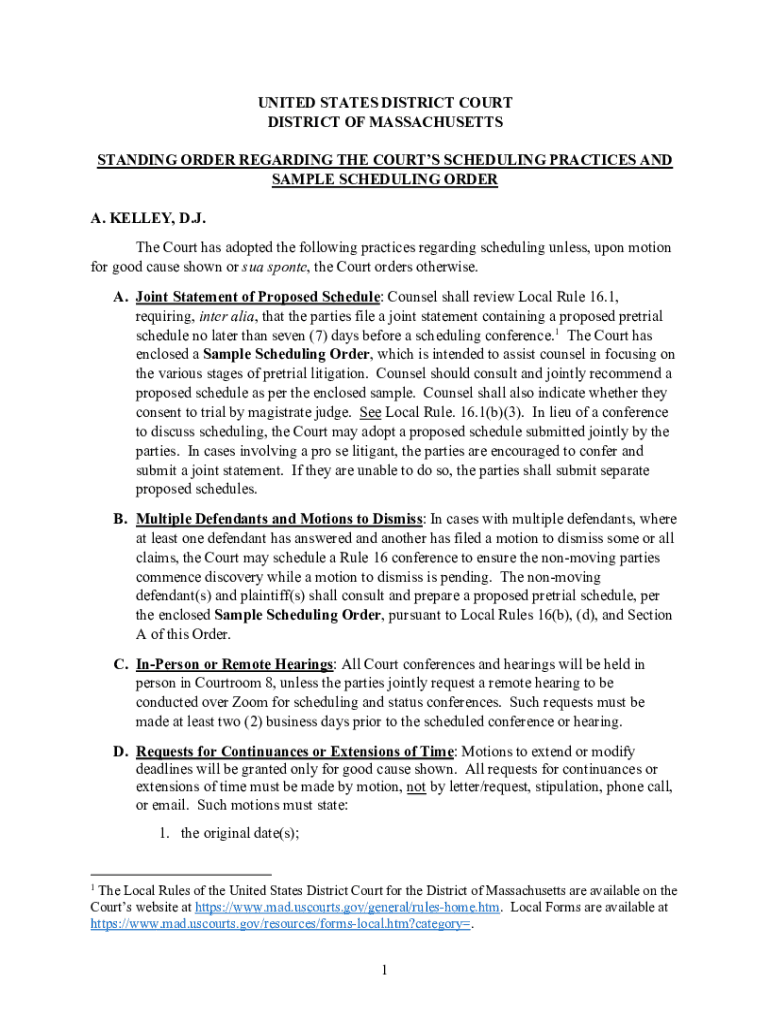 UNITED STATES DISTRICT COURT DISTRICT OF MASSACHUSETTS STANDING ORDER REGARDING THE COURTS SCHEDULING PRACTICES AND SAMPLE SCHEDULING ORDER A. KELLEY, D.J. The Court has adopted the following practices