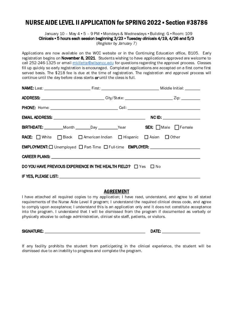 NURSE AIDE LEVEL II APPLICATION SPRING 2022Admission to Nurse Aide Level II for SPRING 2022 is by application. There are ten (10) spaces available. Prospective students must be currently listed on