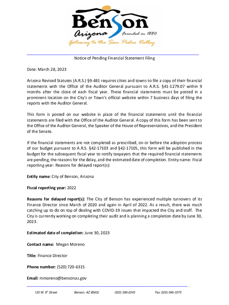 ___ Notice of Pending Financial Statement Filing Date: March 28, 2023, Arizona Revised Statutes (A.R.S.) 9481 requires cities and towns to file a copy of their financial statements with the Office